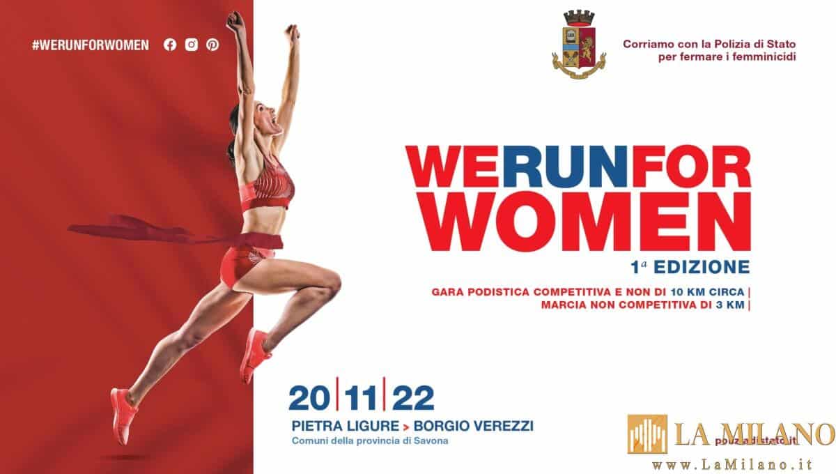 In occasione della giornata internazionale per l’eliminazione della violenza contro le donne, domenica 20 novembre 2022, a Pietra Ligure (SV), si svolgerà la 1ª Edizione di “We run for women – Corriamo con la Polizia di Stato per fermare i femminicidi” promossa dalla Direzione Centrale Anticrimine della Polizia di Stato e organizzata dalla Questura di Savona.
